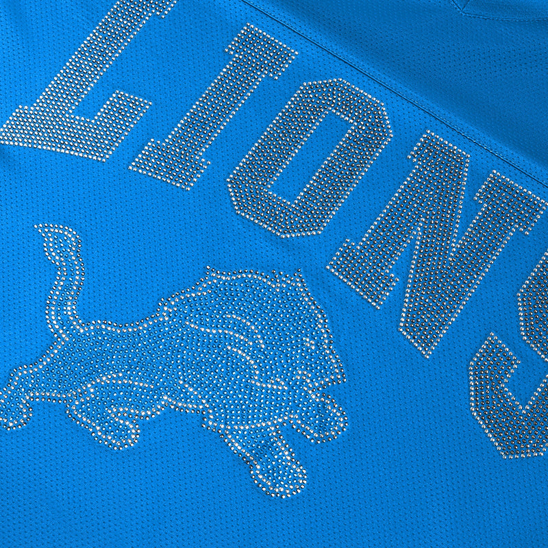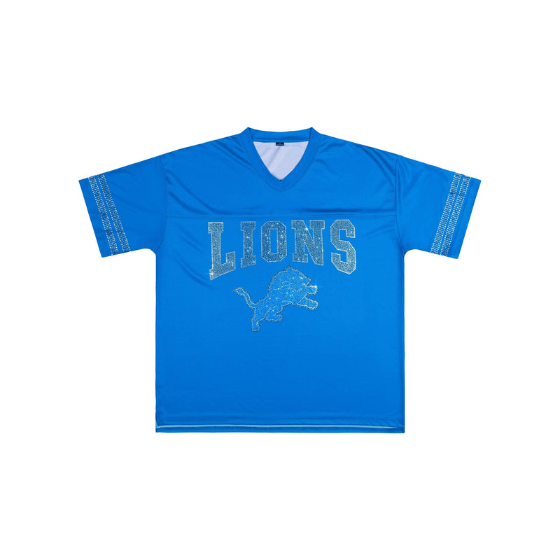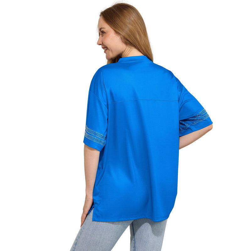 Detroit Lions NFL Womens Rhinestone Logo Oversized V-Neck Mesh T-Shirt