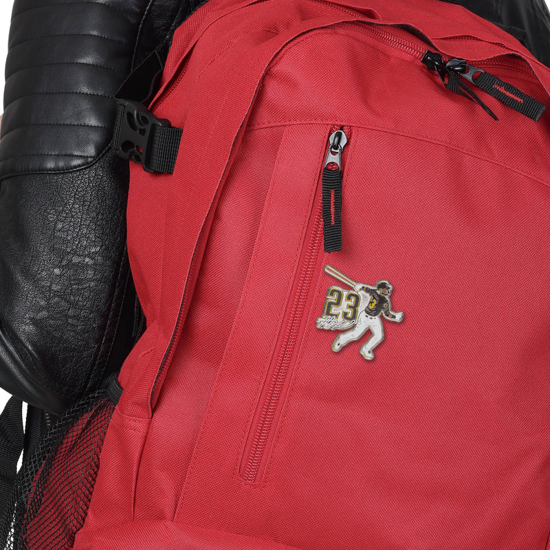 Player pin depicts player wearing his gameday uniform in an action pose, jersey number display, and signature display