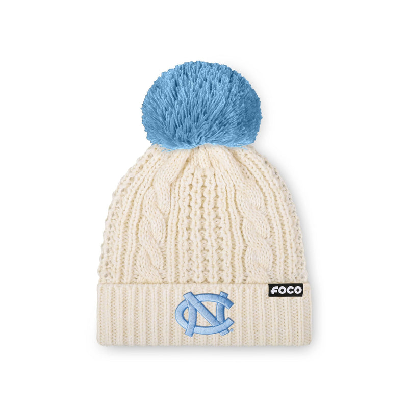 North Carolina Tar Heels NCAA Womens Primary Logo White Cable Knit Pom Beanie